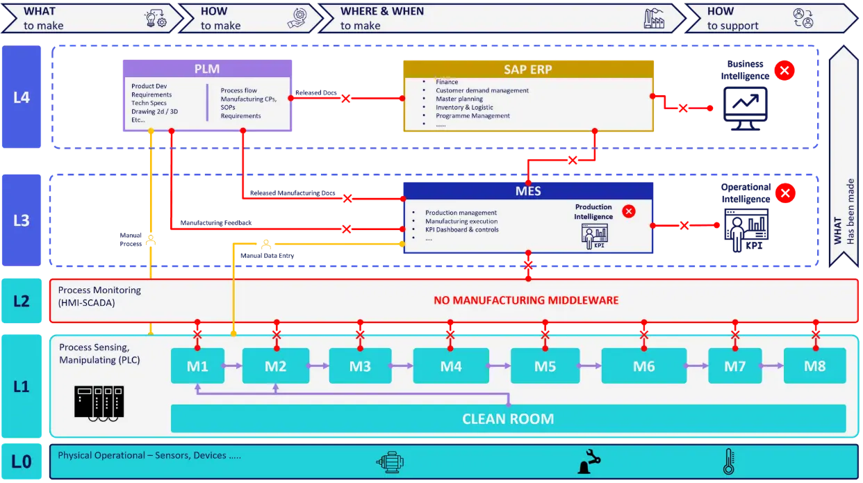 Manual & Disconnected Operations: There is no automated data connectivity between machines and the clients MES. Production relies on manual, error-prone data entry, providing no real-time visibility into performance (OEE), quality, or process parameters.