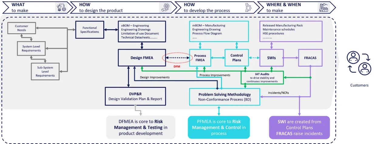 Product & Process - The below diagram outlines a simplified view of New Product Introduce (NPI) process and focuses on the processes, interfaces and the relationships from “What, How, Where and When” to make a product. The aim is to highlight the full lifecycle, how early-stage needs flow to product design, process development and into manufacturing operations, all of which needs to be managed effectively.